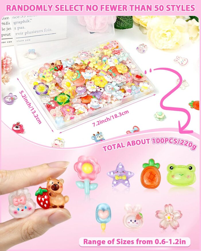 100PCS Kawaii Slime Charms: This bulk set includes around 100 mini 3D charms (0.6in–1.2in) in over 50 unique kawaii styles—bows, fruits, bears, hearts, and more. Whether you’re decorating slime or crafting junk cases, there’s a charm for every project and every creative mood