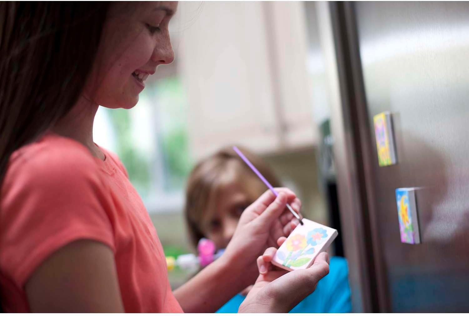 Turn ordinary tiles into art, then attach magnets for cool fridge art