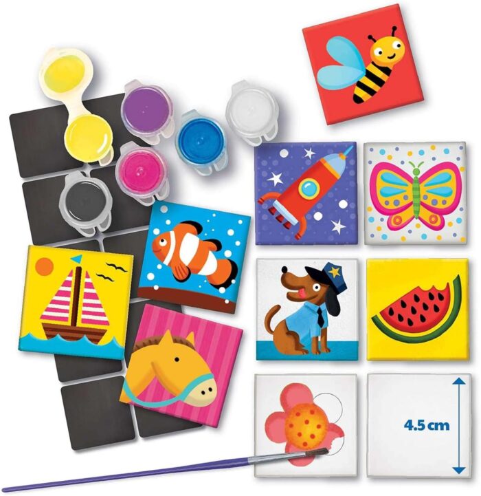 This magnetic tile art set includes tiles, magnets, a paint strip and brush