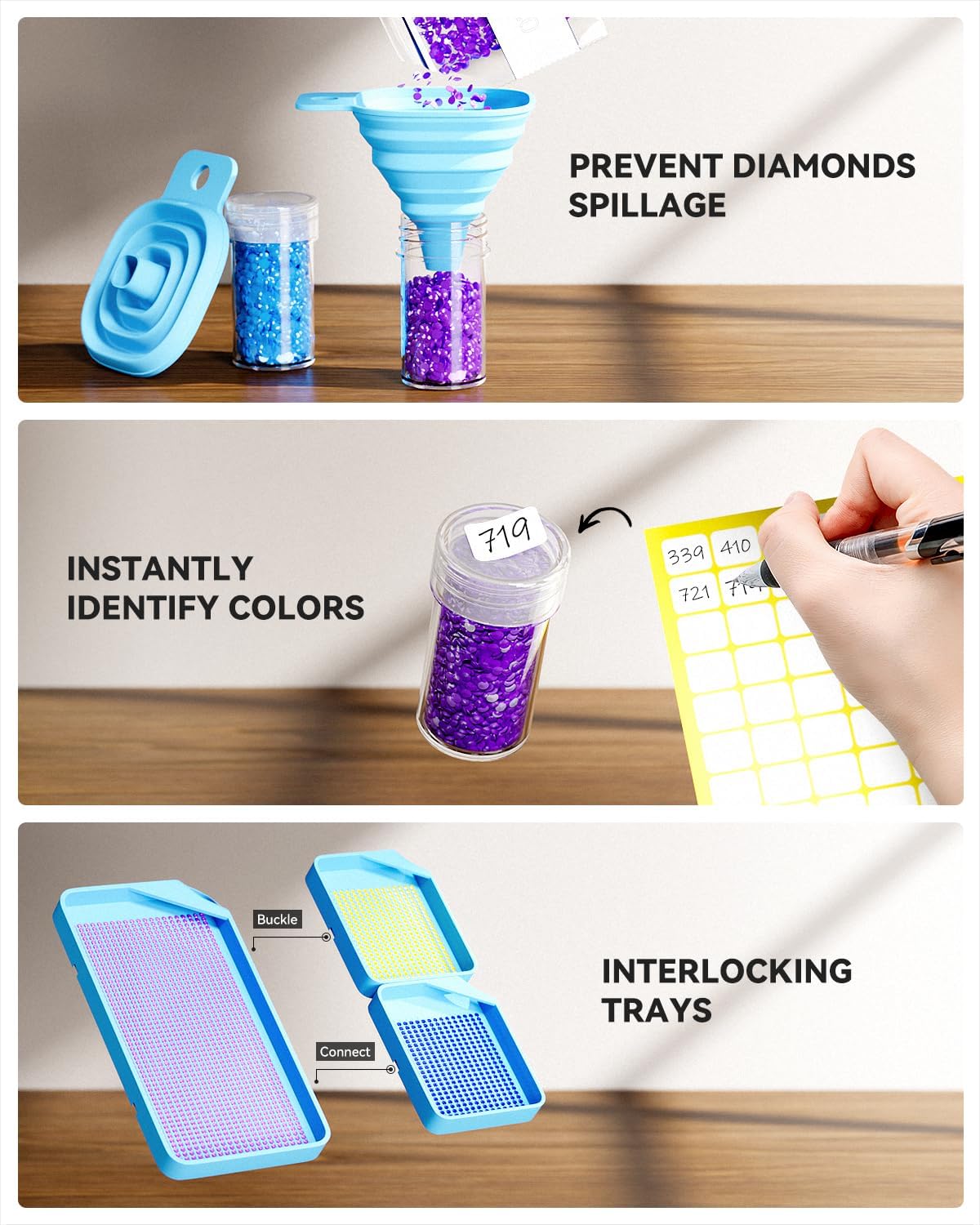 DIAMOND ART KEEPER – The screw on lids design ensures snug fit between cap and bottle, preventing diamonds from spillage during movement. The dual zipper structure prevents the bottle and accessories from falling out, enhancing safety during use