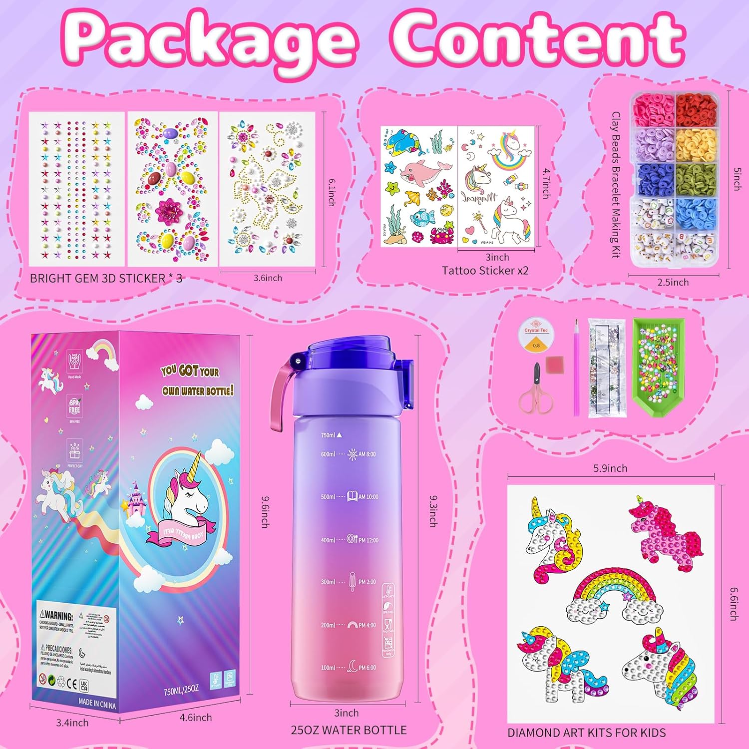 🦄Unicorn Painting Crafts: Multiple popular kits stimulate kids’ endless creativity and sense of achievement: 1*Unicorn Theme DIY Diamond Gem Arts and Crafts Kit for girls aged 4-12 (including 5 patterns), 1*Clay Beads Bracelet Making Kit, 4* Vibrant and Sparkling 3D Diamond Stickers, and 2* Tattoo Stickers. Decorate your own water bottle is attractive toys for 6+ year old girl. Every girl can easily make unique unicorn water bottle has in their mind!