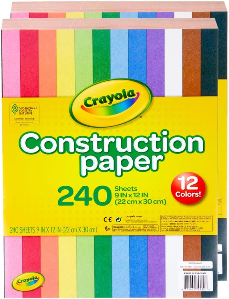Crayola Construction Paper is essential to creative fun! From easy paper crafts for kids to detailed art projects, colorful construction paper is perfect for a wide variety of artistic projects. This bundle includes two 240 sheet Construction Paper packs for a total of 480 sheets. A must-have for all home and school project drawers, each pack features 9 x 12 construction paper sheets and is conveniently bound into a pad for easy use. Each sheet of 9 x 12 inch craft paper is ideal for school projects, arts and crafts in classrooms, and childrens art supplies. Includes 48 sheets of Pink, Red, Orange, Yellow, Green, Blue, Purple, Brown, White, and Black Construction paper. Great for artists and crafters of all ages! Pair with Crayola Crayons, Markers, Colored Pencils and more! Crayola school supplies for students and teachers are ideal for back to school, classroom projects, and creative learning at home or in school.