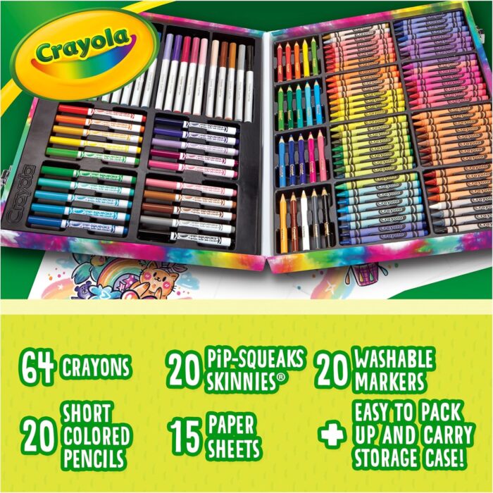 Spark creativity with the Crayola Inspiration Art Case Coloring Set in Tie-Dye. This portable art kit includes 140 art supplies—40 washable markers, 20 short colored pencils, 64 crayons, and 15 large sheets of paper (9 x 13 inches). The durable, compact case doubles as a storage organizer and lap desk, making it easy for kids to create at home or on the go. Perfect for road trips, playdates, or moving from room to room, this set keeps everything neat and ready for use. Opening the case reveals a vibrant spectrum of colors that inspires young artists to explore their imagination. Designed for convenience and durability, it’s a reliable companion for any creative adventure. Makes a great Christmas gift and holiday present for kids, excellent Christmas gifts for grandkids, and ideal for festive celebrations like Hanukkah and family gift exchanges. All supplies are safe, nontoxic, and suitable for ages 5 and up. Give the gift of creativity with this all-in-one art kit! This makes a delightful Easter basket essential—perfect as a cheerful Easter basket stuffer that adds creative fun to any spring celebration.