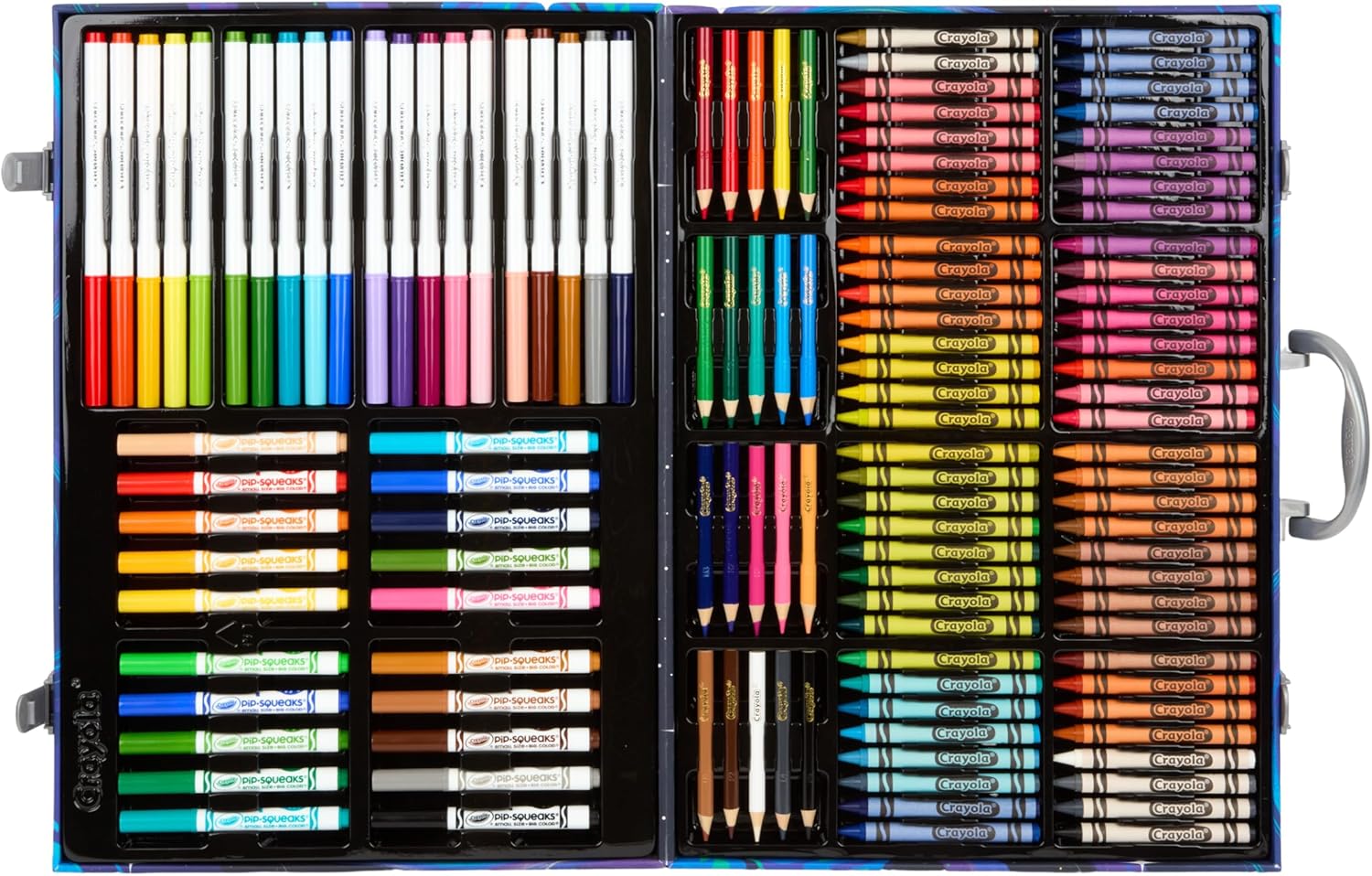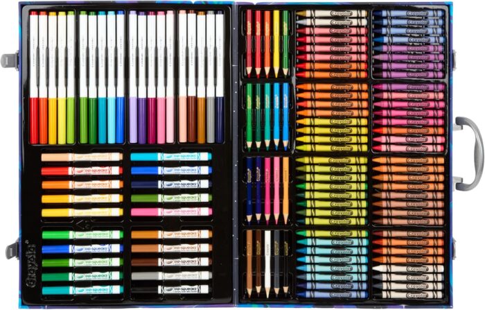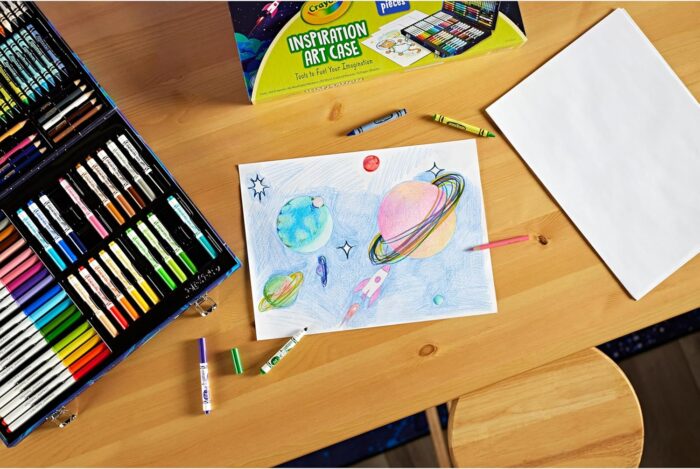 140-PIECE CRAYOLA ART KIT: Includes 64 Crayola Cayons, 40 Washable Markers, 20 Short Colored Pencils, 15 Large Drawing Sheets, and a durable space-themed art case for kids who love to create.
