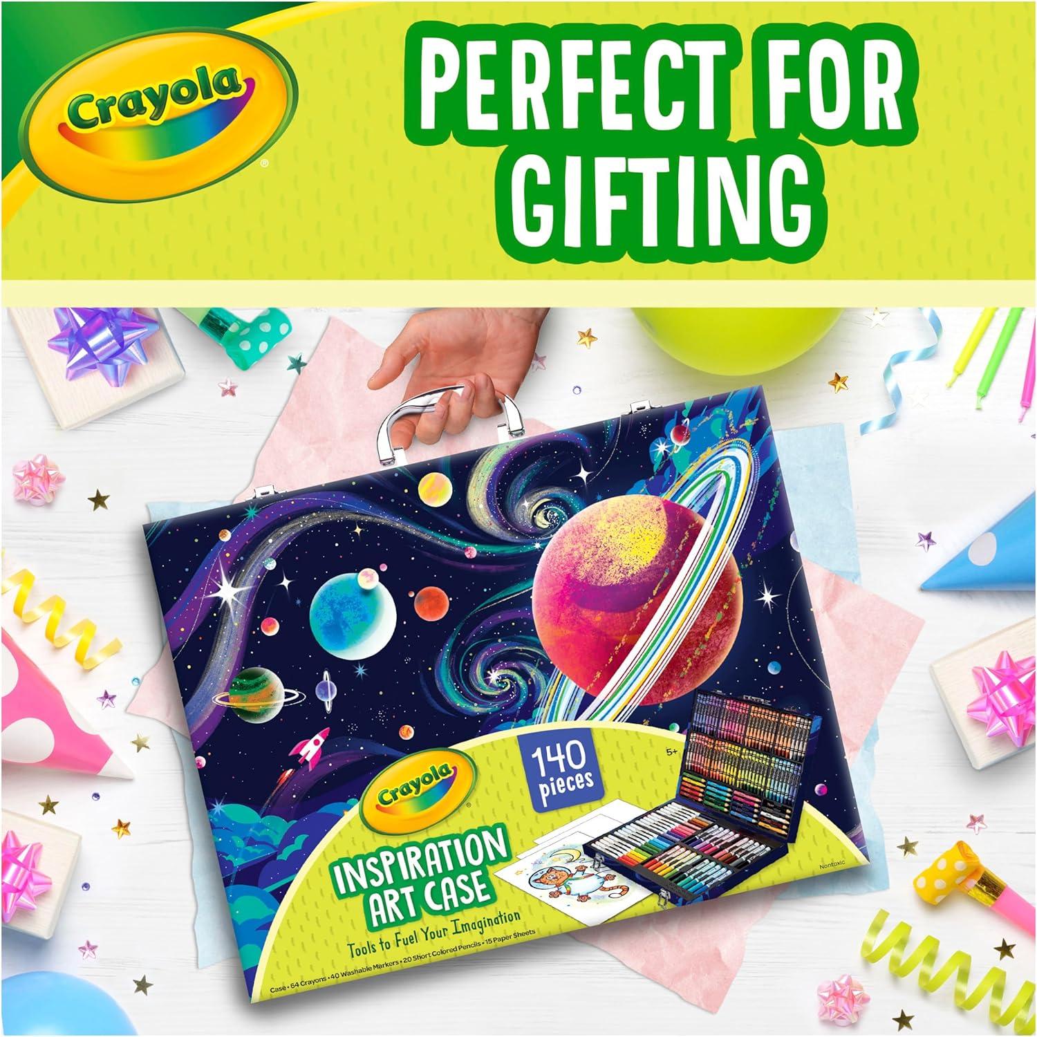 Unveil the magic of creativity with the Crayola Kids Art Kit! This 140-piece drawing set includes everything young artists need to explore their imagination: 40 washable markers, 20 short colored pencils, 64 crayons, and 15 large sheets of paper (9 x 13 inches). All supplies are stored in a durable, space-themed carrying case featuring trays, compartments, two locking latches, and a folding handle for easy portability. (Product design may vary.) With a wide range of bright, bold, and subtle colors, this art kit is perfect for school projects, art class, or creative activities at home. The variety of tools helps kids develop fine motor skills, hand-eye coordination, and artistic confidence as they draw, color, and experiment with different styles. It’s an excellent starter kit for beginner crafters and young artists who want to explore new techniques and express their creativity. This set makes a great Christmas gift for kids, excellent Christmas gifts for grandkids, and a fun holiday present for boys and girls—ideal for festive celebrations like Hanukkah and family gift exchanges. Safe and nontoxic, this comprehensive Crayola art kit is perfect for ages 5 and up and turns every creative moment into a colorful adventure. This makes a delightful Easter basket essential—perfect as a cheerful Easter basket stuffer that adds creative fun to any spring celebration. This product is ACMI Certified.
