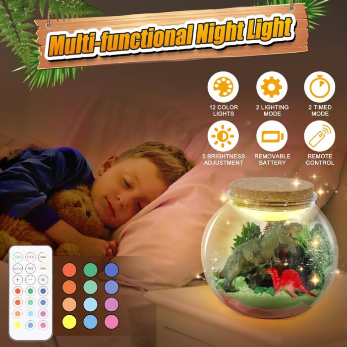Introducing our Dinosaur Terrarium Kit, the ideal gift for boys aged 5-12! This all-in-one kit combines the excitement of dinosaur toys with the creativity of a terrarium, providing endless fun and educational value. Watch as your child’s imagination comes to life with this unique terrarium kit. They can create their very own prehistoric world by assembling the included dinosaur toys and decorating the terrarium with sands,rocks, plants, and other accessories. The LED night light feature adds a magical touch, illuminating the terrarium and creating a captivating ambiance at bedtime. It’s not just a toy, but also a functional night light that will bring comfort and peace to your little one’s room.This kit is not only a fantastic birthday gift for boys, but it also promotes hands-on learning and encourages an interest in science and nature. It’s a wonderful way for kids to explore the world of dinosaurs and develop their creativity and problem-solving skills.Made with high-quality materials, our Dinosaur Terrarium Kit is built to withstand the rough and tumble play of active boys. It’s a durable and long-lasting toy that will provide hours of entertainment and imaginative play.Whether your child is a dinosaur enthusiast or simply loves toys that spark their curiosity, our Dinosaur Terrarium Kit is the perfect choice. Let their imagination run wild as they create their own dinosaur park. Order now and surprise your little adventurer with this unforgettable gift!