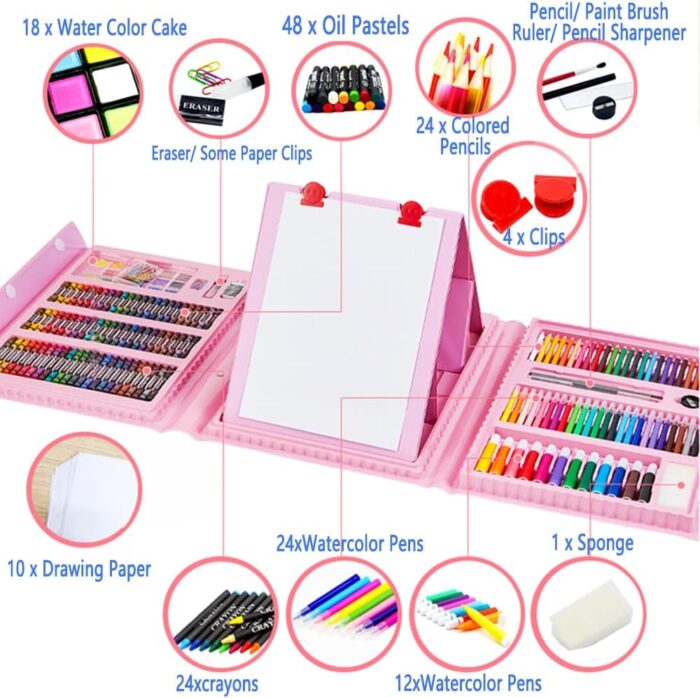 DLUCKY 208 PCS Art Supplies, Drawing Art Kit for Kids Adults Art Set with Double Sided Trifold Easel, Oil Pastels, Crayons, Colored Pencils, Watercolor Pens Gift for Girls Boys Artist,Pink