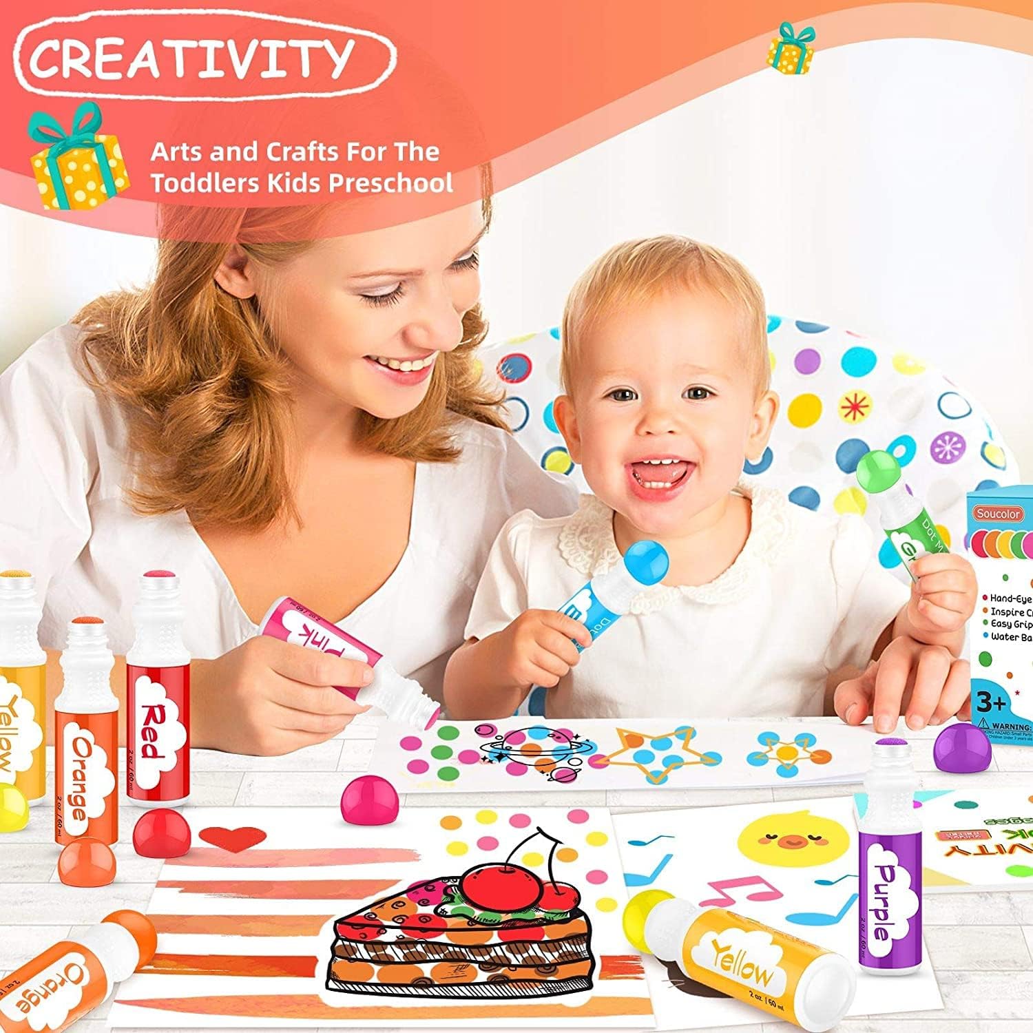 【Vibrant Color Range】With a set of 8 vibrant colors—red, orange, yellow, green, blue, purple, pink, and brown, our Soucolor Dot Markers provide endless possibilities for young artists to create beautiful works of art. Whether they’re working on a coloring book or creating their own masterpieces, these markers are perfect for adding dots of color and transforming plain paper into a vibrant canvas, making art time an explosion of color and fun for toddlers and preschool children. (without Activity Book)