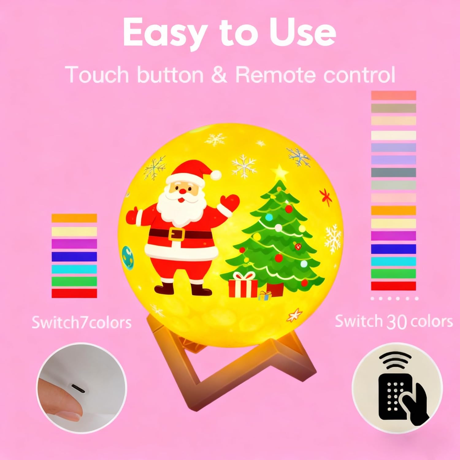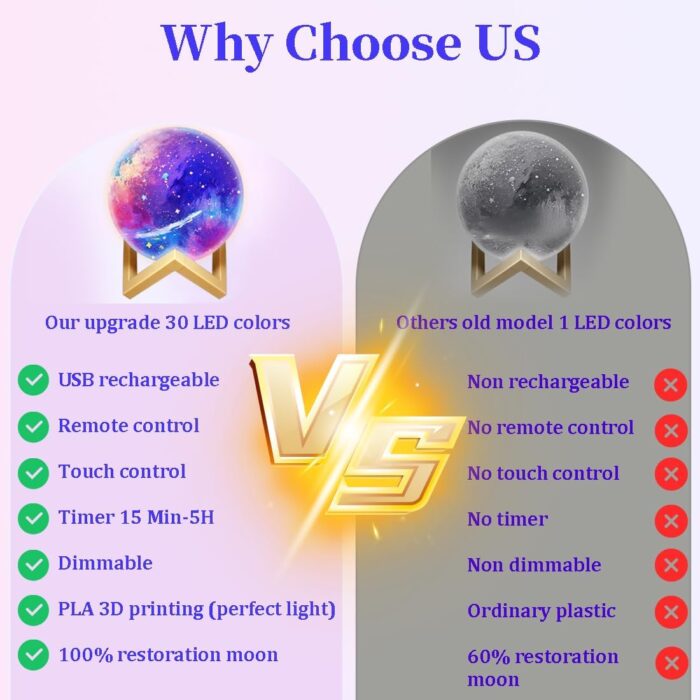 2025 Upgrade- We have added a charging function. When it is out of power, you can use a Type-C charging cable to charge it. And we have also added a remote control. You can use the remote control to switch 30 different light colors, and you can also use the remote control to set the timer function for 15 minutes -30 minutes -45 minutes -1 hour -2 hours -5 hours. Touch the metal ring of the moon lamp charging port to switch between 7 different light colors. It is so convenient.