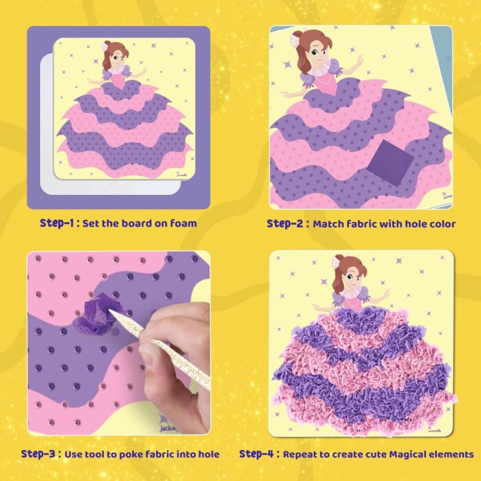 POKE POKE ART KIT: Engage your child’s creativity with this poke poke art activity! Kids can poke in and decorate magical things like princesses, unicorns, mermaids using fabric squares and foam shapes without any mess—no glue, cutting, painting, or coloring required.