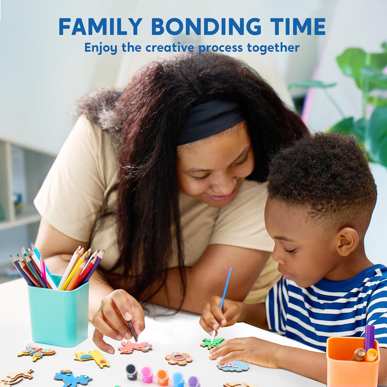 UNIQUE DESIGN & EASY TO USE. Our 12 pieces of paint your own arts and crafts kit will unleash your kid’s creativity. Your kids will learn how to mix paints and express themselves through decorating art by making wooden crafts magnets.