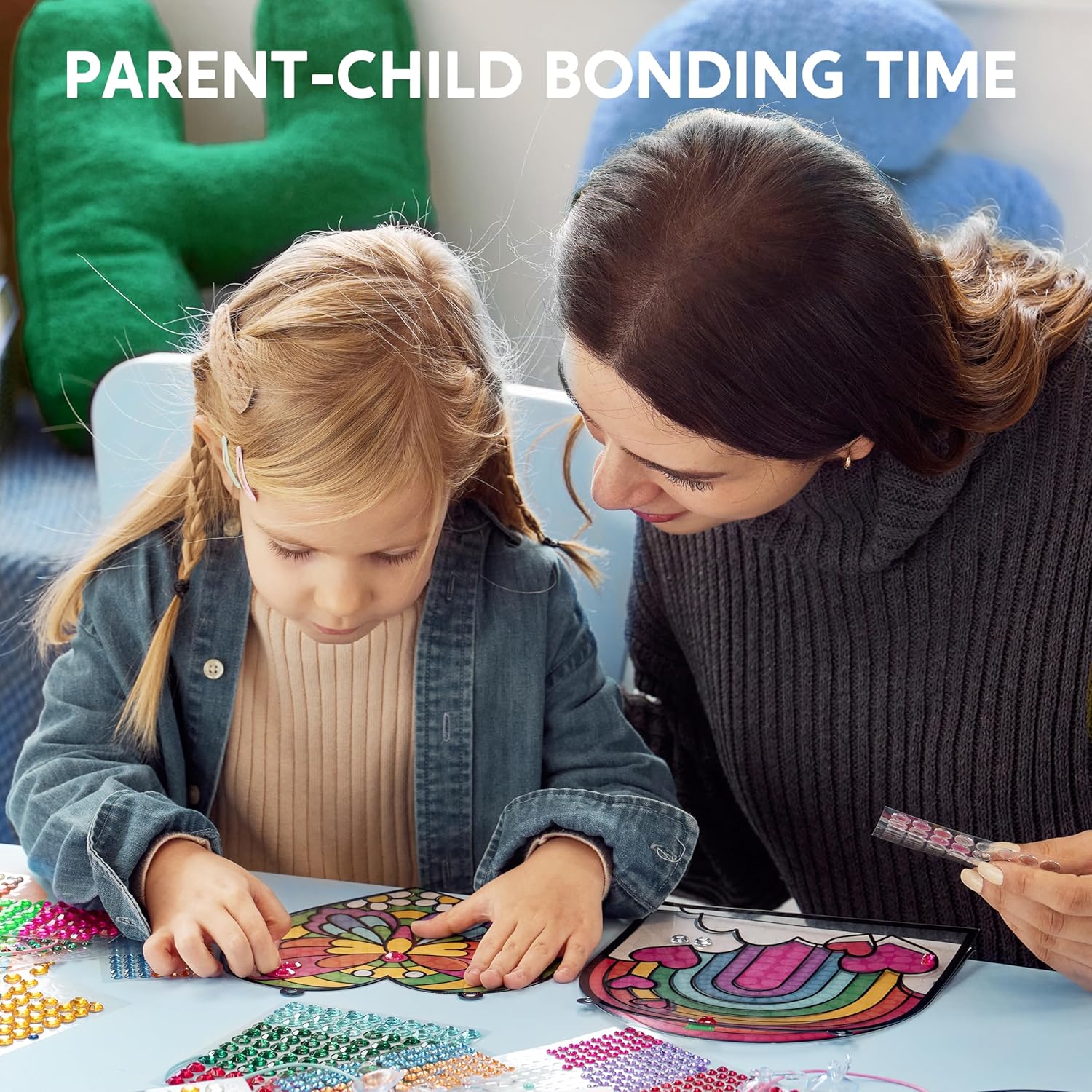 Complete Crafting Experience: Our craft kit includes everything needed for an immediate start. With 4 pre-printed window designs, 4 color guides, over 1200 gemstone stickers in 9 colors and 2 sizes, 4 ropes, and 4 suction cups, your child can dive into the world of window art immediately