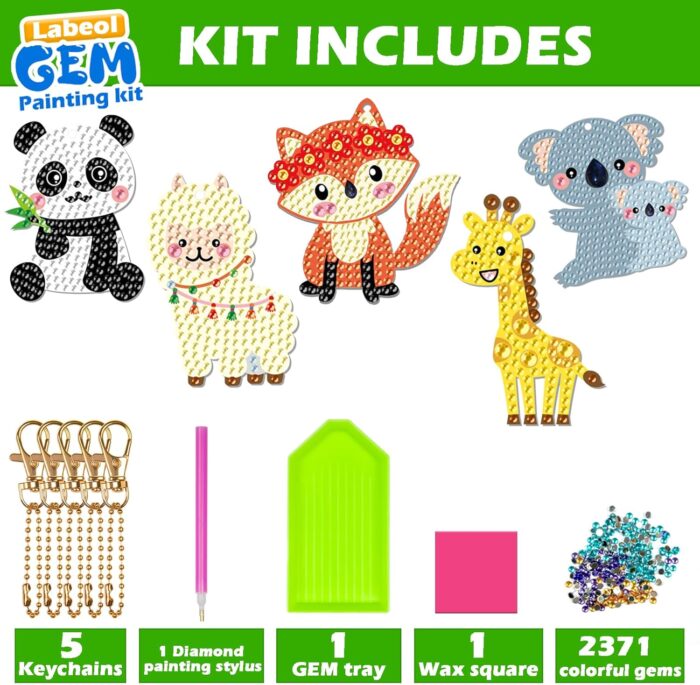 🌳MAKE YOUR OWN DIAMOND KEYCHAINS- All diamond art gem for kids tools that you need are Include! Our Package includes five cute animals gem keychains patterns: Fox, Giraffe, Alpaca, Panda and Koala. 5 unfinished diamond keychains, 1 stylus, 1 wax square , 1 tray and 2000+ gems