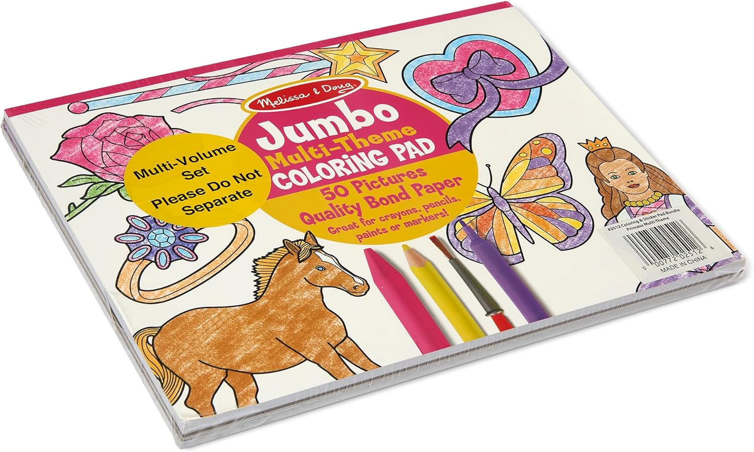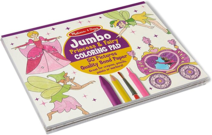 Jumbo Princess & Fairy Coloring Pad features 50 pages of high-quality bond paper, printed with 50 unique designs; great for colored pencils, craytons, markers, or pens