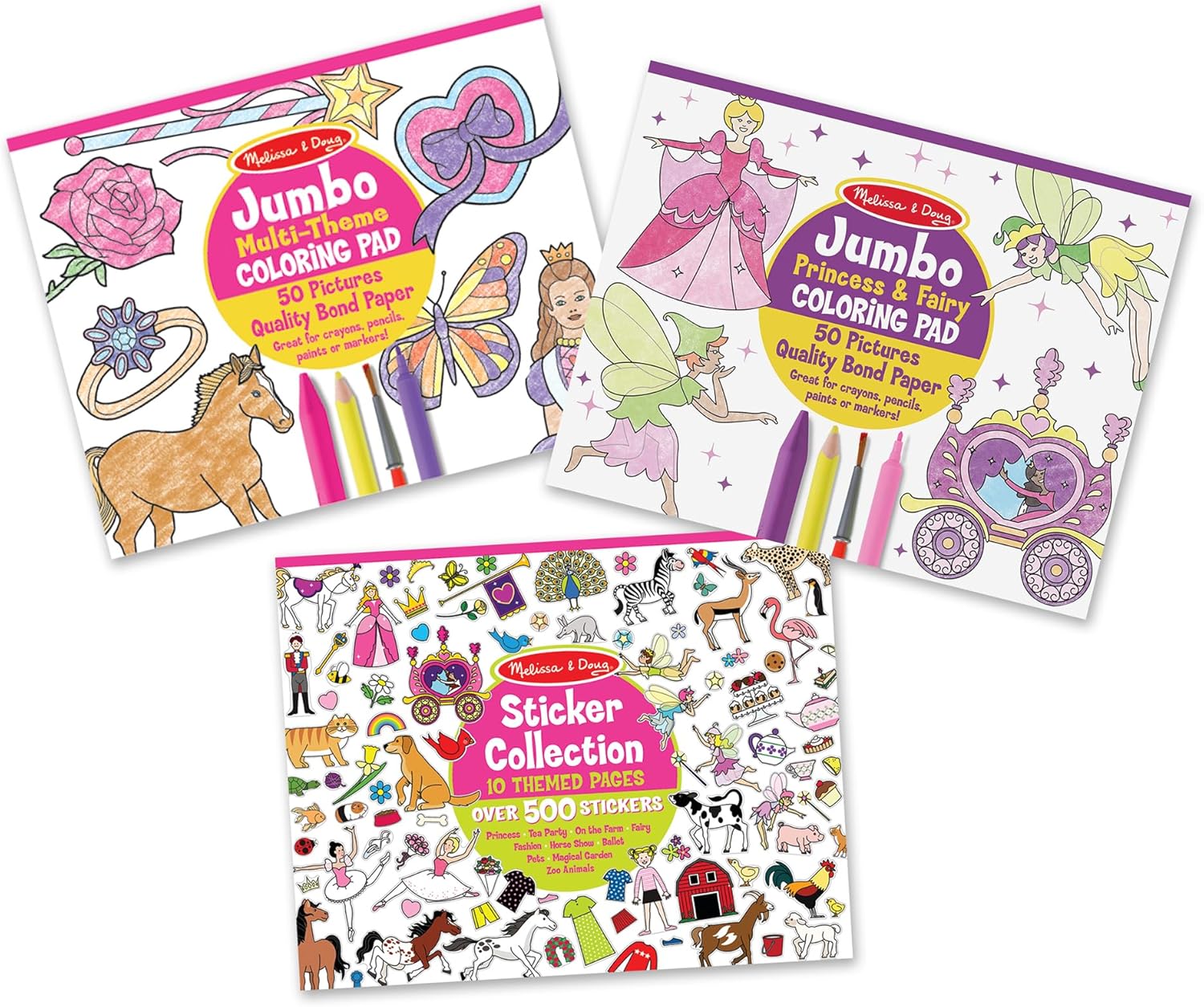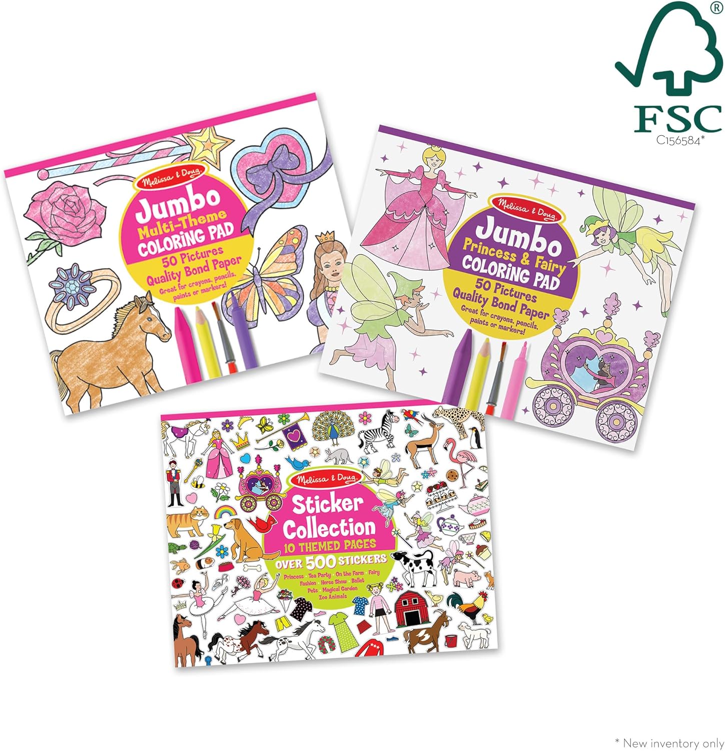 This pink-and-purple bundle includes 100 coloring pages and over 500 stickers! Bound into three oversize pads that are perfect for home or travel, each page is packed with pretty possibilities. Girls and boys can color in the 11×14” pictures using crayons, markers, pencils, or paints to fill pretty pictures of fairies, princesses, butterflies, rainbows, and more. The stickers can add beautiful accents to the pages . . . or stick just about anywhere! Each page tears out cleanly for easy sharing or display, and the coloring pages are printed on top-quality white bond paper to prevent bleed-through and tearing. Children will return to this pretty art-activity collection time and time again! This product is certified by the Forest Stewardship Council. FSC certification ensures that products come from responsibly managed forests that provide environmental, social, and economic benefits, and that forests are protected for future generations. Please note that FSC certification applies to new inventory only (FSC C156584)