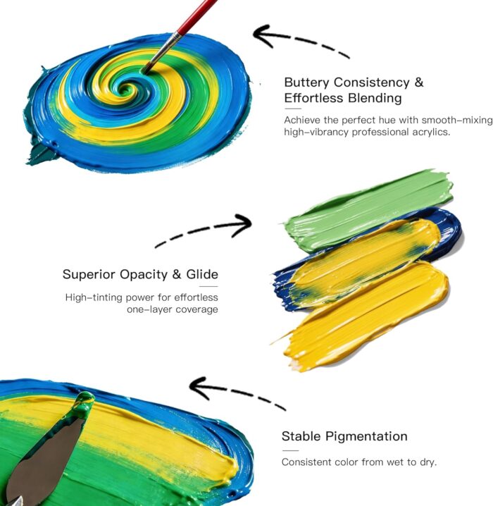 Premium professional Pigments: The acrylic paints are formulated with a high pigment load to deliver intense, true-to-life colors. Unlike standard craft paints, we use advanced grinding technology to ensure high saturation and pure hues that remain vibrant even after drying, satisfying the demands of professional artists for color accuracy.