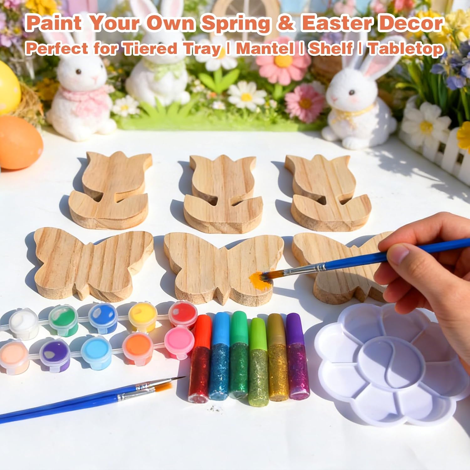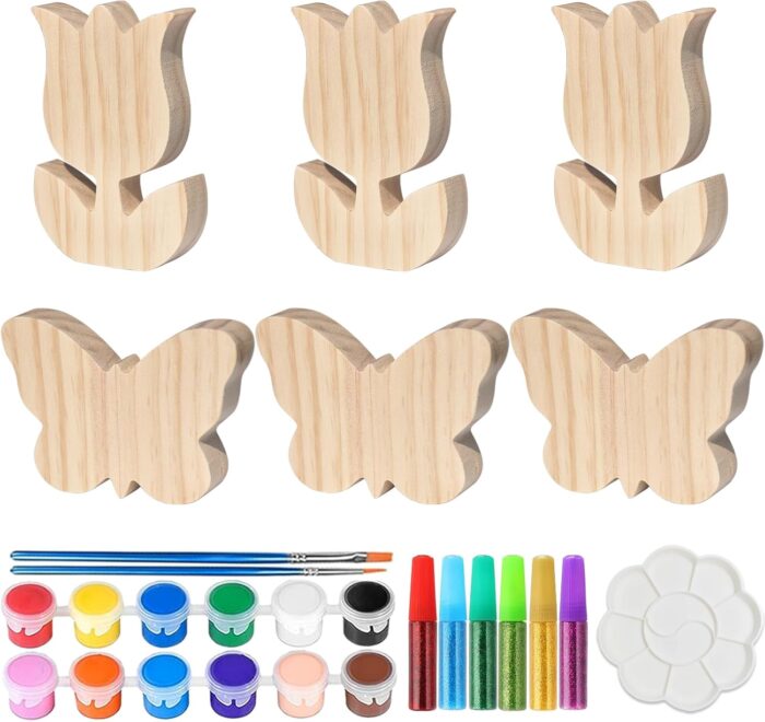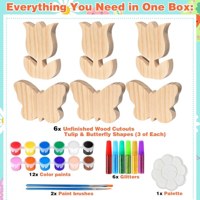 Spring Easter Wood Cutouts Painting Kit, 6 Pack Tulip Butterfly Shapes, Unfinished Blank Wood Slices with Art Supplies, DIY Farmhouse Crafts for Home Decor, Shelf Mantel Tiered Tray Tabletop