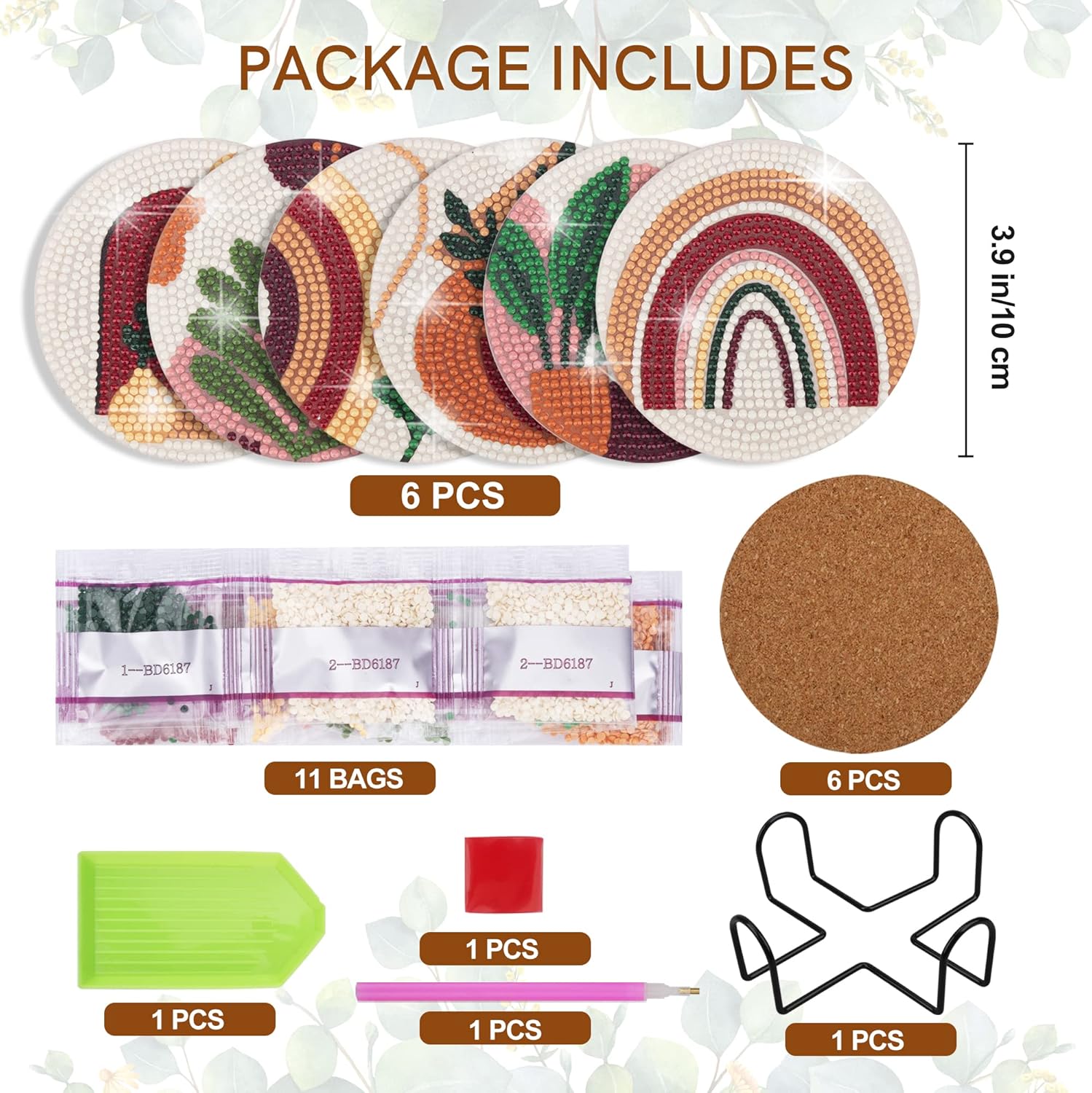 Package Include: Diamond Painting Coaster x 6, Cork Pad x 6, Coaster Holder x 1, Colorful Diamond x 11, Clay Glue x 1, Pen x 1, Diamond Tray x 1