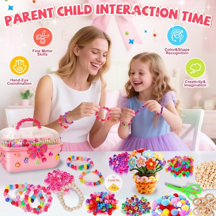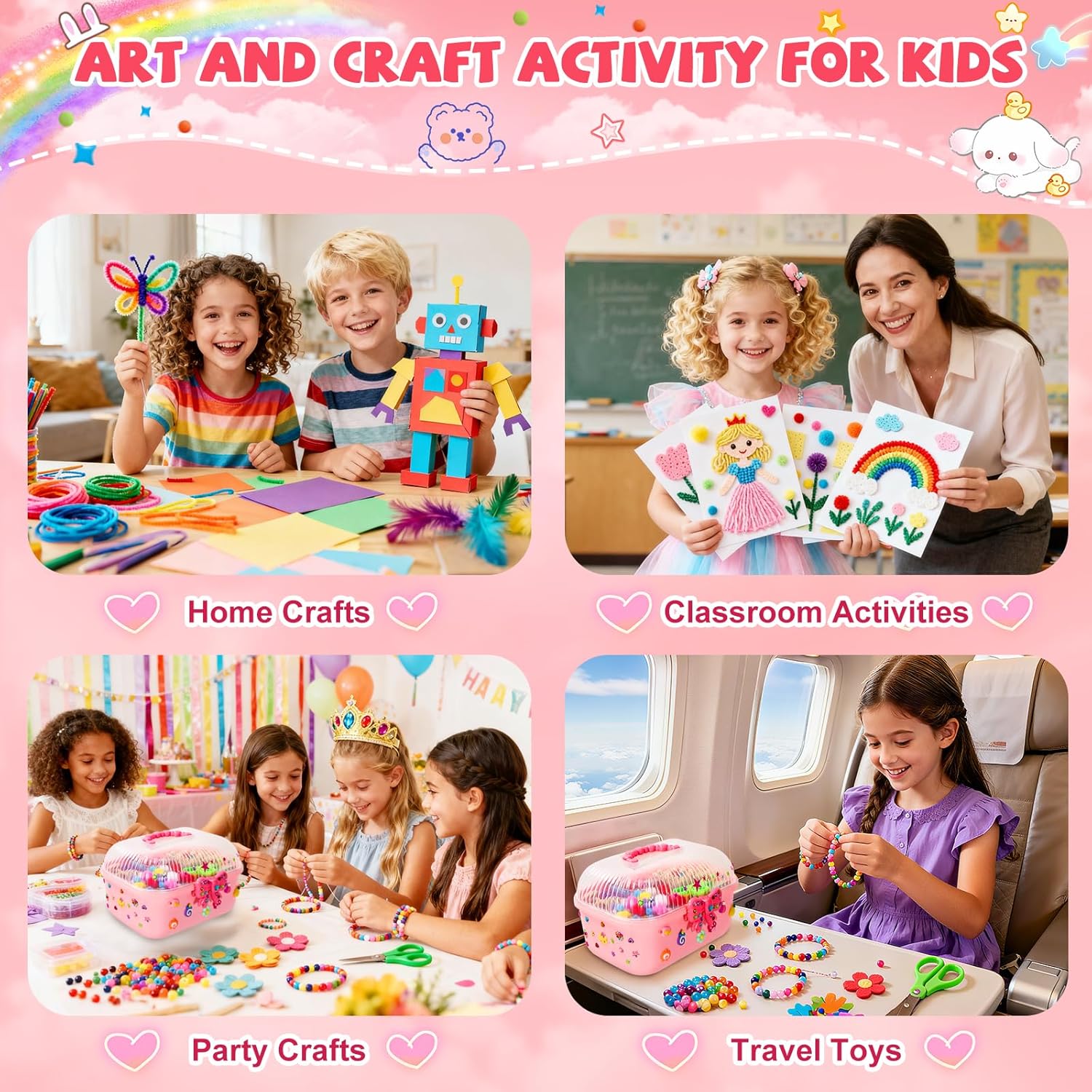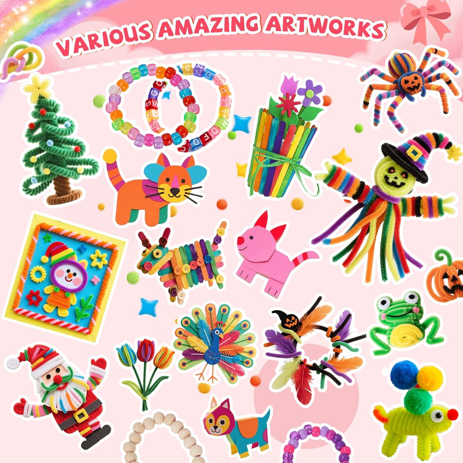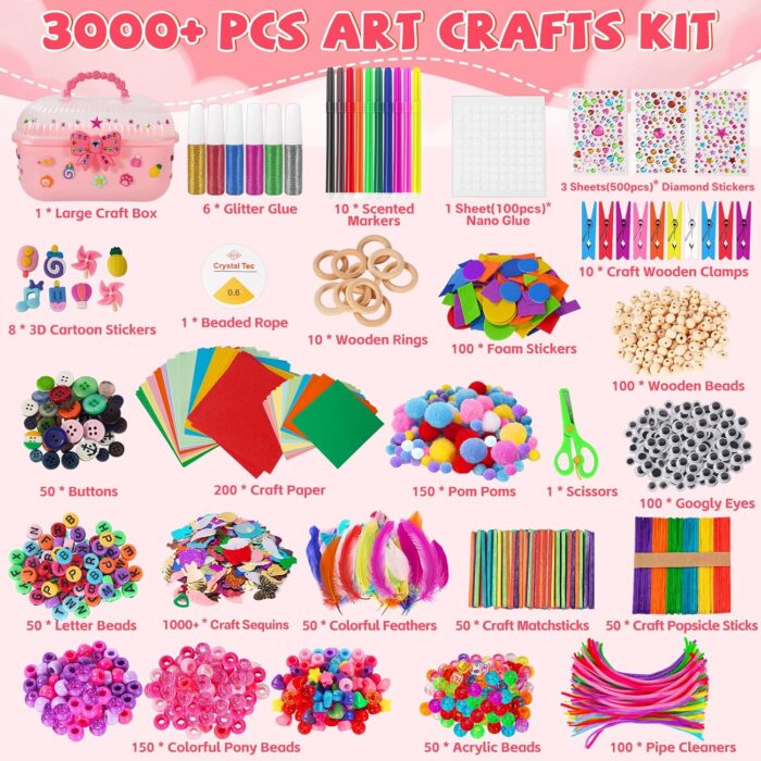 Ultimate Kids Arts and Crafts Activity Kit: Includes over 3000+ accessories, Large Craft Box(10.2*8.3*6.3in),Pipe Cleaners, Craft Popsicle Sticks, Craft Matchsticks, Acrylic Beads, Googly Eyes, Pom Poms, Colorful Feathers, Foam Stickers, Craft Sequins, Colorful buttons, Letter Beads, Colorful Pony Beads, Craft Paper, Wooden Rings, Wooden Beads, Craft Wooden Clamps, Scissors, Beaded Rope, Diamond Stickers, 3D Cartoon Stickers, nano glue, Scented Markers,and Glitter Glue.
