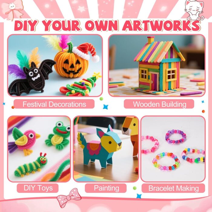 DIY Kid’s Own Exclusive Artwork – Set off on a captivating journey of art and craft. Our art and craft kits for kid have 25+ different craft materials, children can unleash their unlimited imagination to create their own unique works, such as Christmas trees, small swings, plants, small animals, bracelets, necklaces, jewelry making, DIY room decoration and other handicrafts.