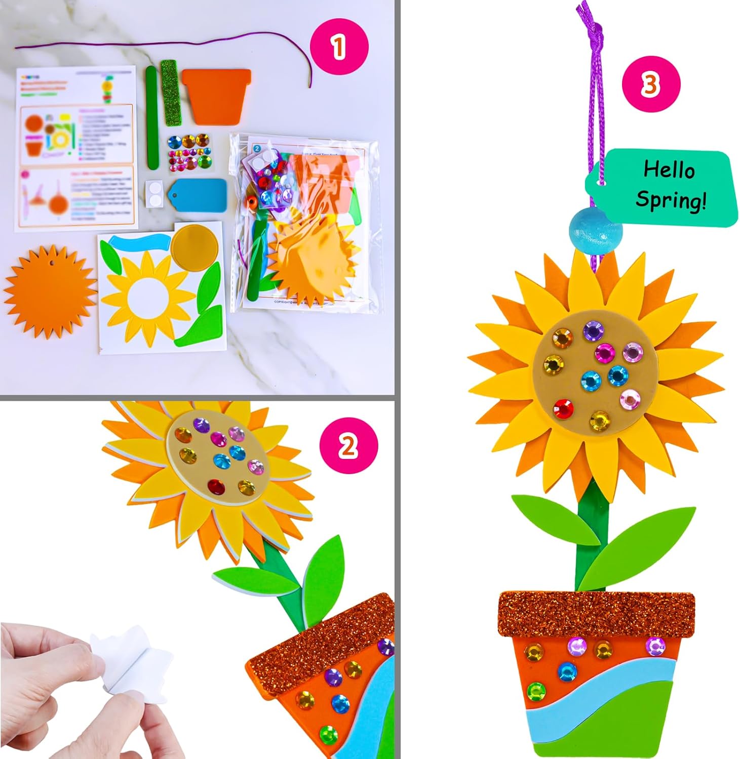 Strong, Safe, and Perfect Crafts for Kids: The spring flower head and pot foam bases are made from sturdy 3mm thick foam that doesn’t tear easily. The foam stickers and glitter foam edge stickers come with adhesive backing. These spring craft kits are ready to go, making them perfect for kids to enjoy crafting fun without any hassle. Simply thread a cord, add a bead and tag, stick on the decorations, finish by writing a message on the tag, and your colorful spring ornament is ready to show off.