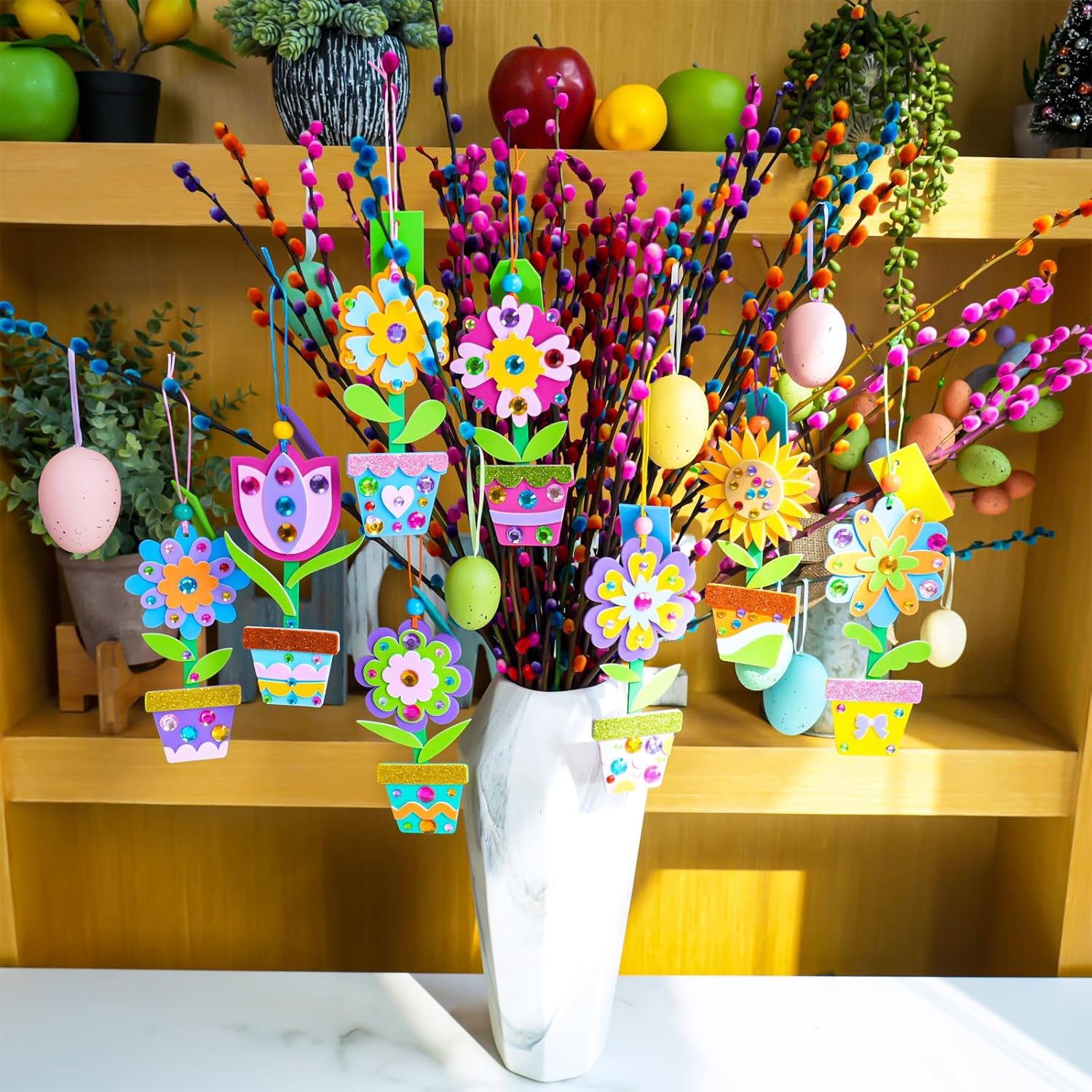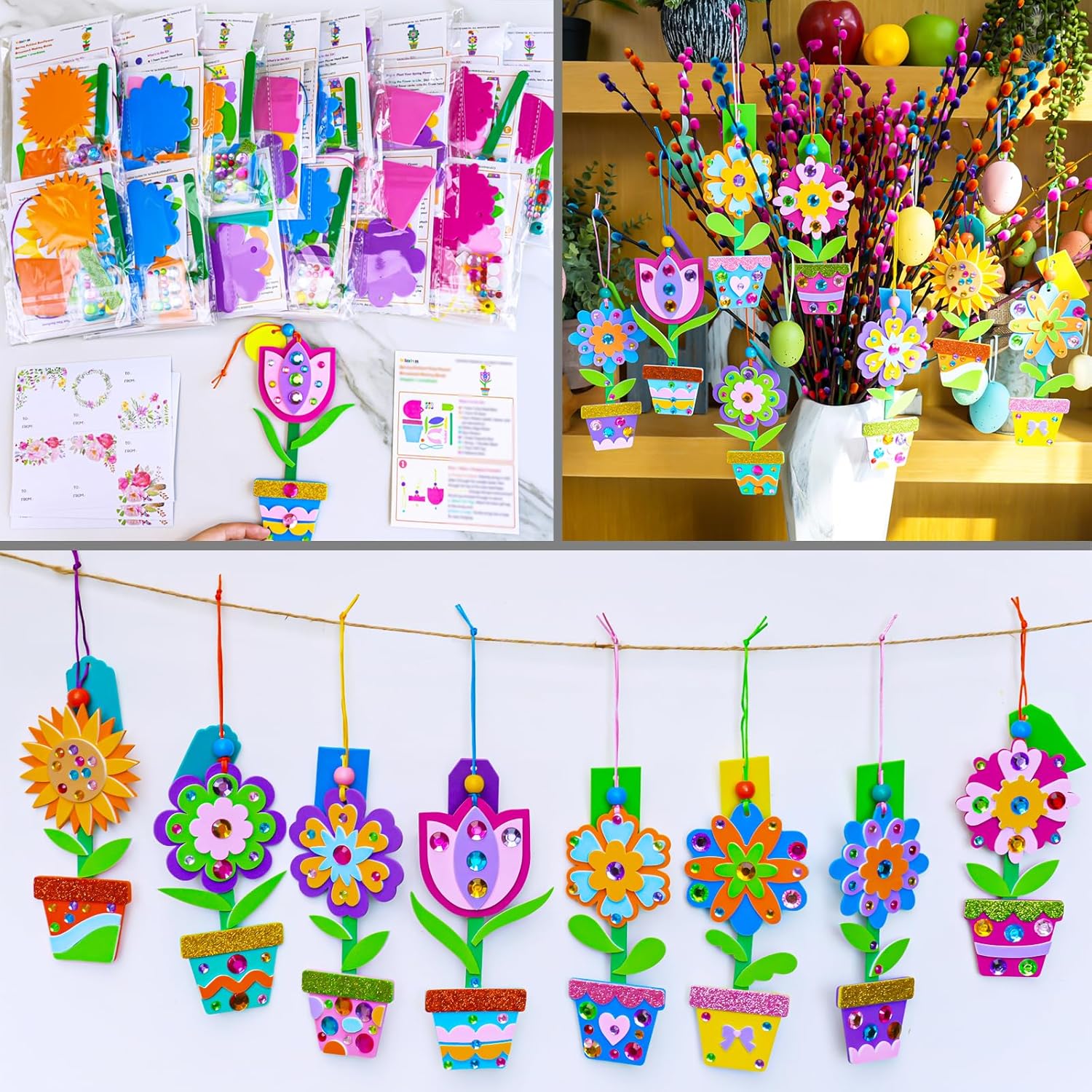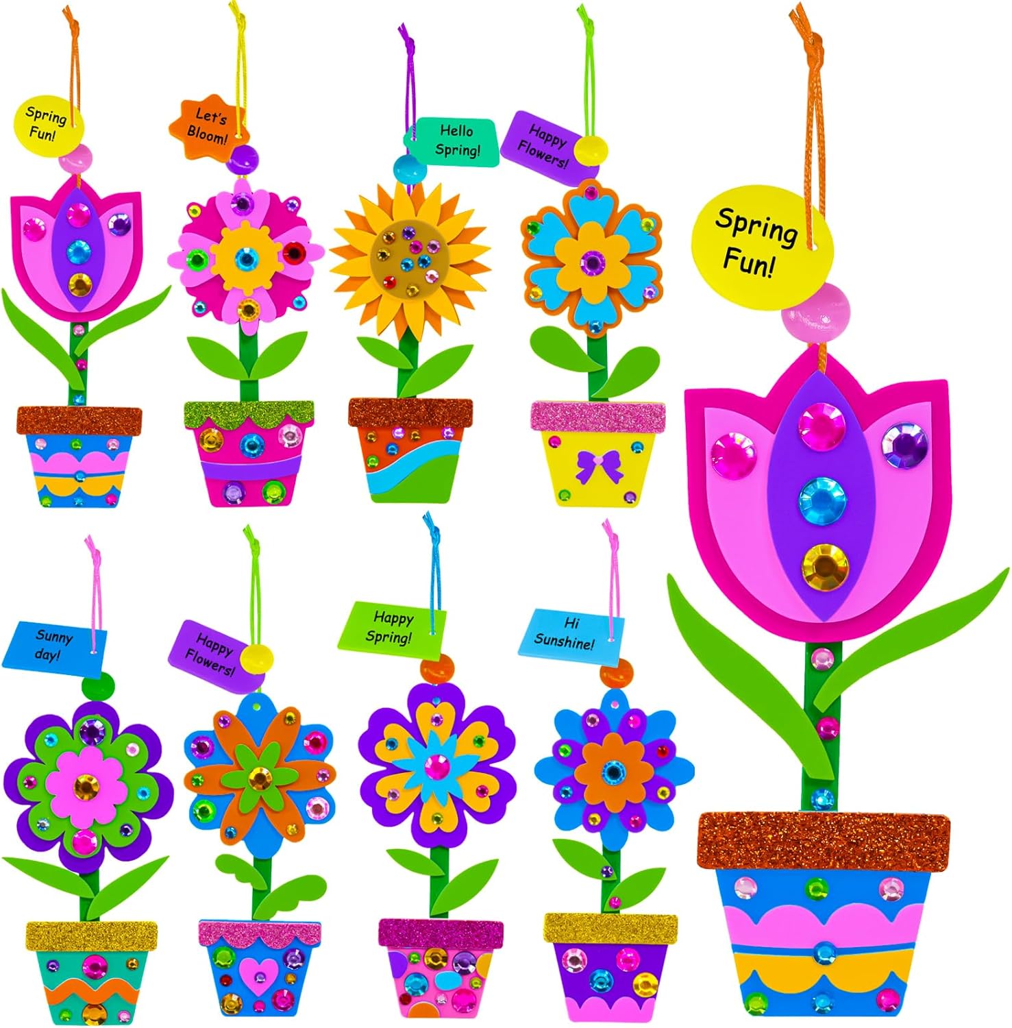 24 Sets Spring Potted Flower Ornament Craft Kits: This springtime craft set includes 24 Sets Spring Potted Flower Ornament Making Kits, featuring 8 unique designs with 3 kits of each type. Each individually wrapped kit contains everything kids need for a delightful crafting experience: 1 foam flower head base, 1 foam pot base, 1 sheet of foam stickers, 1 glitter pot edge sticker, gem stickers, 1 green popsicle stick, 1 cord for hanging, 1 wood bead, 1 foam gift tag, 2 adhesive dots, and 1 guide.
