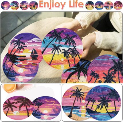ijbnhd 8 Pcs Diamond Art Coasters Kits, Sunset Diamond Painting Coasters Kit with Holder, Diamonds Art Non Slip Coaster Crafts Kits for Adults Gifts 4×4 inch (Cork Wooden Pad)